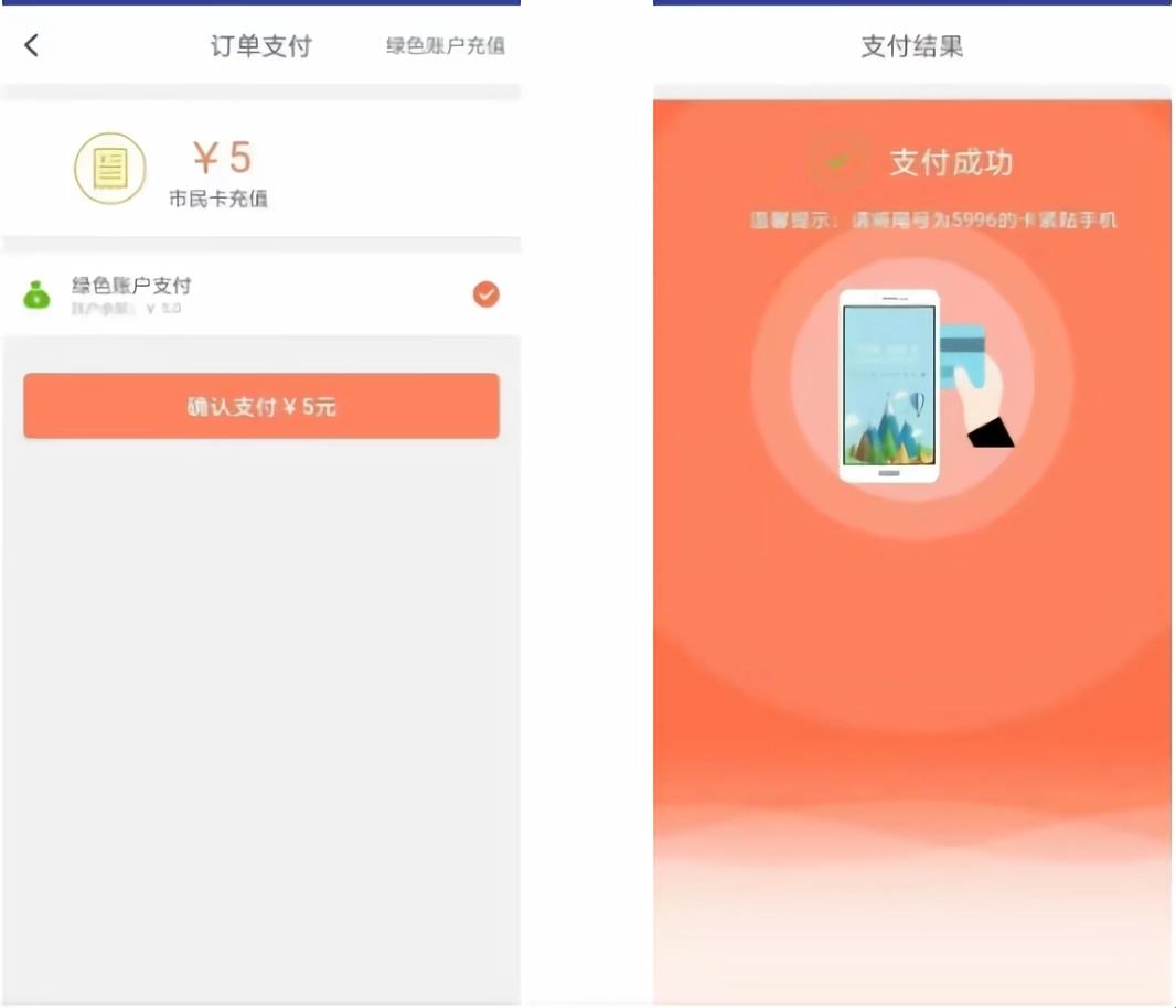 确认支付,输入6位支付密码。支付成功后,再次将卡片紧贴手机NFC天线处,完成对卡片的充值。把卡片贴在NFC天线处还可以查看“消费记录”与“充值记录”。