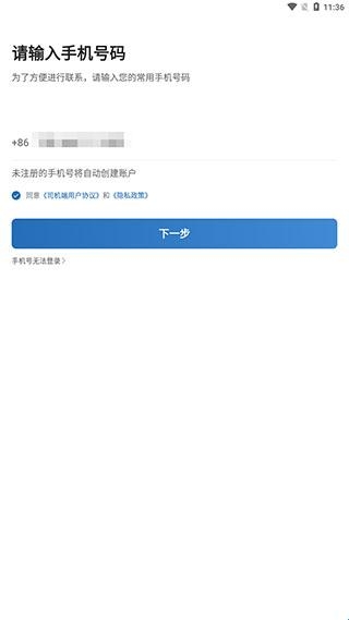 1、首先我们需要在飞马出行司机端app中完成【注册登录】,输入手机号后点击下一步。