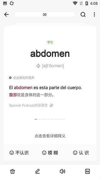 5、导入完成后即可开始学习,每学完一个单词点击底部认识或不认识切换下一个。