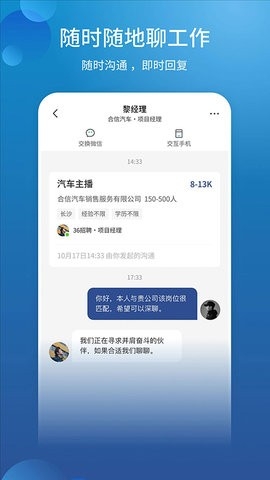 1、以聊天的方式找工作,像微信App一样,随时随地约聊,当场拍板,闪电入职;