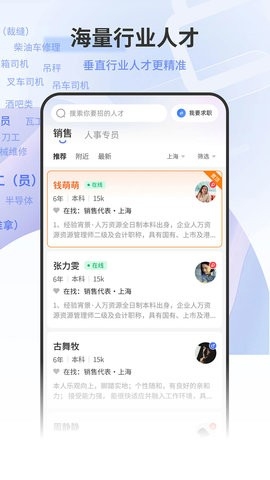 1、个性化推荐职位:根据用户的求职意向和个人简历,上海直聘软件可以为用户推荐最适合自己的职位,增加了求职的成功率。