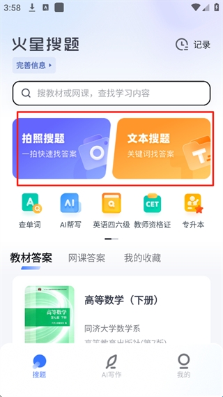 2、另外,不光有网课和教材答案,且还提供了两种不同的搜题方式;