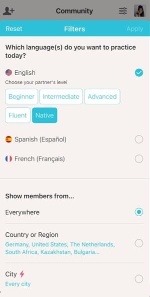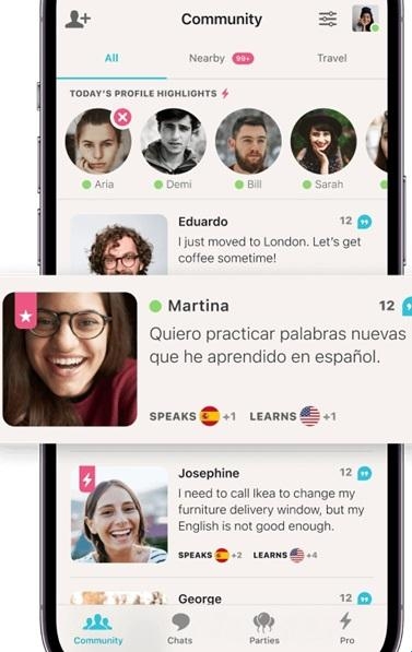选择任何方式进行对谈:信息、语音信息、语音或视屏通话。软件中还内建修正和翻译工具帮助语言交换更顺畅。
