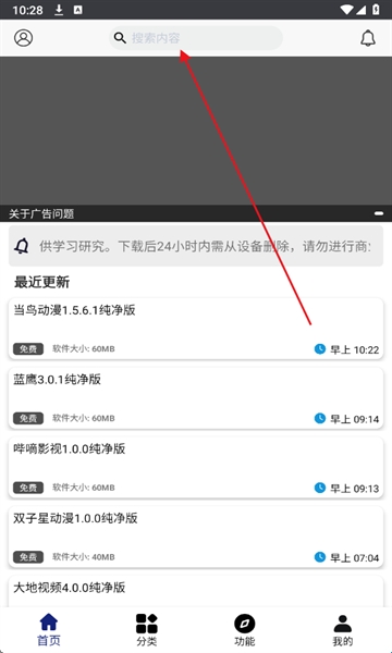 1、下载软件并打开,点击上方搜索内容,可以快速查找自己想要下载的软件