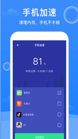 3、手机加速:释放手机内存,清理拖累手机运行的应用,提高手机流畅度
