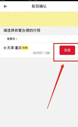 4、然后接下来的页面我们就可以看到需要值机的航班的信息了,我们选择点击确认信息无误后,然后我们选择点击“选座”的选项。