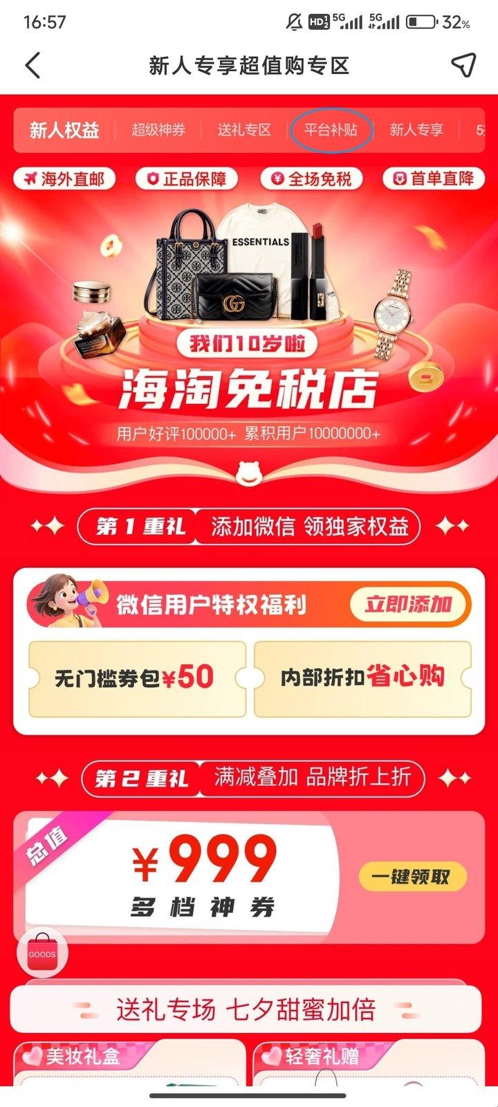 2、在屏幕上方找到“平台补贴”或者“送礼专区”板块。