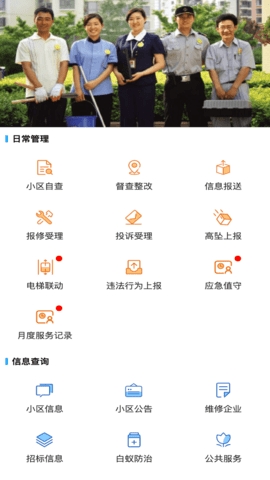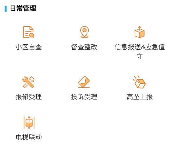 涵盖小区自查、督查整改、报修受理等物业日常运营及应急处理相关功能