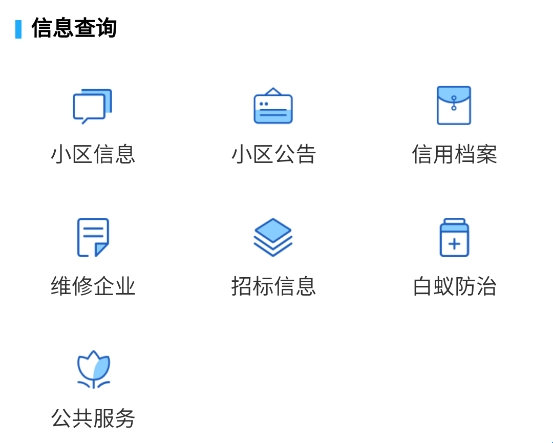 可查询小区信息、公告、信用档案,以及维修企业、招标、白蚁防治等各类物业相关信息
