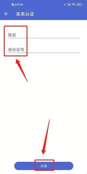4、进入实名认证界面,输入姓名、身份证号,点击【认证】即可