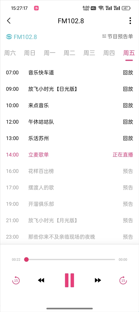 4、每个广播右侧都有个详情箭头,点击进入可以看到每个时段的广播,再次点击可以进行回放