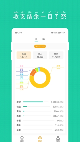 3、系统会每个月为用户进行收支结余分析,分析图表一目了然。