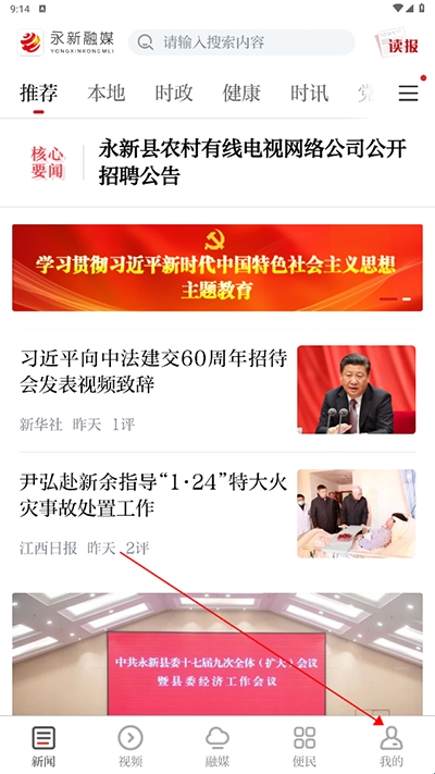 1、下载后打开进入永新融媒app,在首页下方点击【我的】;